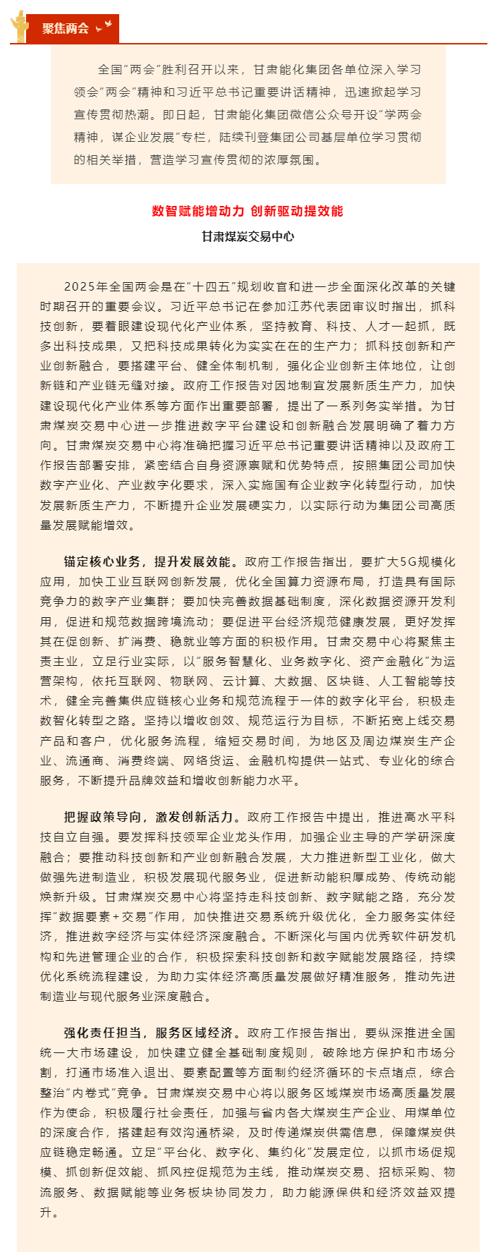 学两会精神 谋企业生长 | 甘肃煤炭生意中心数智赋能增动力 立异驱动提效能