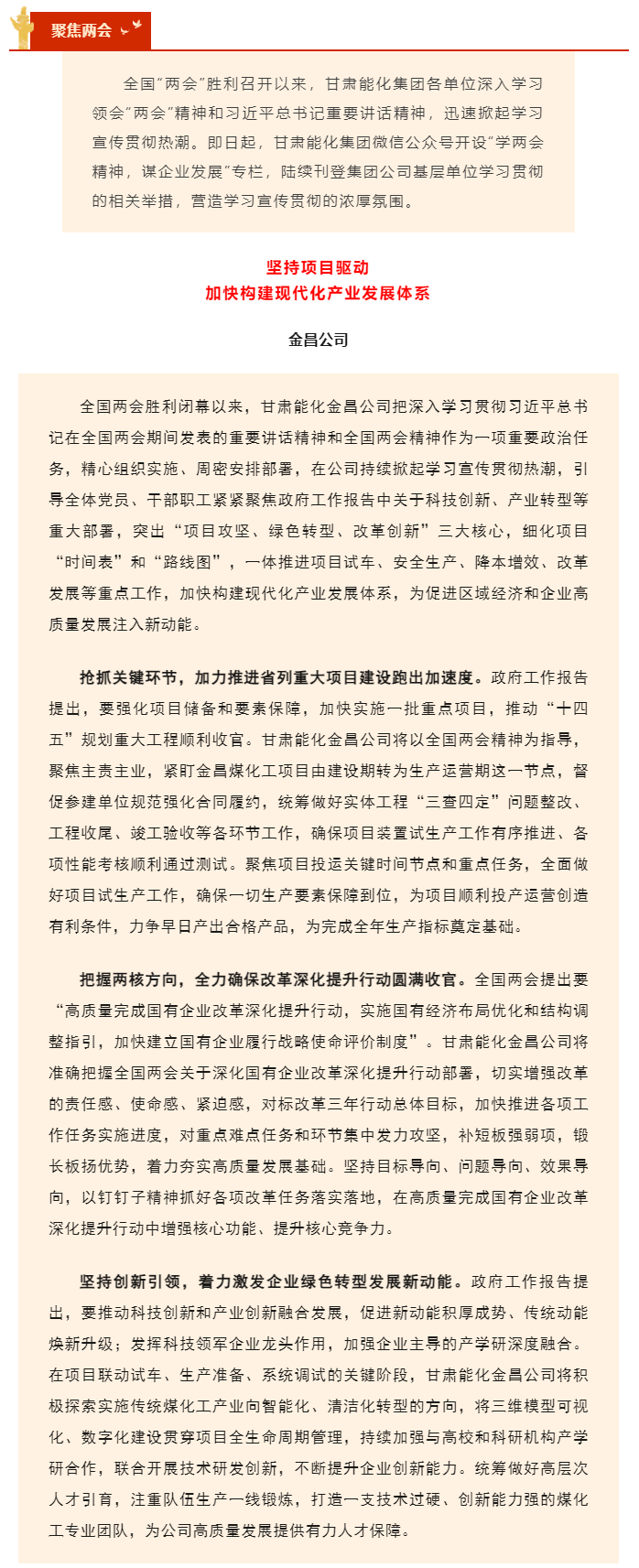 学两会精神 谋企业生长 | 金昌公司坚持项目驱动 加速构建现代化工业生长系统