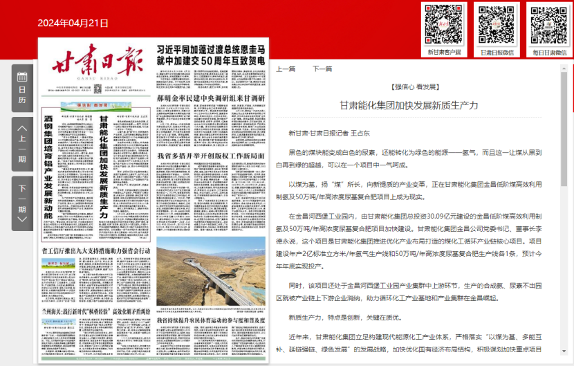 同时,该项目还处于金昌河西堡工业园工业集群中上游环节,生产的合成氨、尿素不出园区就被工业链上下游企业消纳,助力循环化工工业基地和工业集群在金昌崛起。
