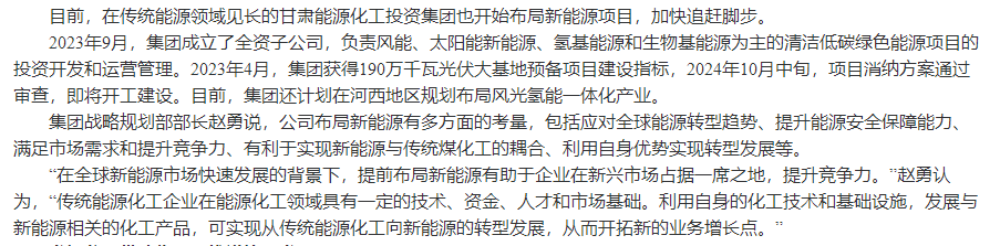 2023Äê9Ô £¬¼¯ÍލÉèÁËÈ«×Ê×Ó¹«Ë¾ £¬ÈÏÕæ·çÄÜ¡¢Ì«ÑôÄÜÐÂÄÜÔ´¡¢Çâ»ùÄÜÔ´ºÍÉúÎï»ùÄÜԴΪÖ÷µÄÇå½àµÍ̼ÂÌÉ«ÄÜÔ´ÏîÄ¿µÄͶ×Ê¿ª·¢ºÍÔËÓª¹ÜÀí¡£2023Äê4Ô £¬¼¯ÍÅ»ñµÃ190ÍòǧÍß¹â·ü´ó»ùµØ×¼±¸ÏîÄ¿½¨ÉèÖ¸±ê £¬2024Äê10ÔÂÖÐÑ® £¬ÏîÄ¿ÏûÄɼƻ®Í¨¹ýÉó²é £¬¼´½«¿ª¹¤½¨Éè¡£ÏÖÔÚ £¬¼¯ÍÅ»¹ÍýÏëÔÚºÓÎ÷µØÇøÍýÏë½á¹¹¾°ÎïÇâÄÜÒ»Ì廯¹¤Òµ¡£