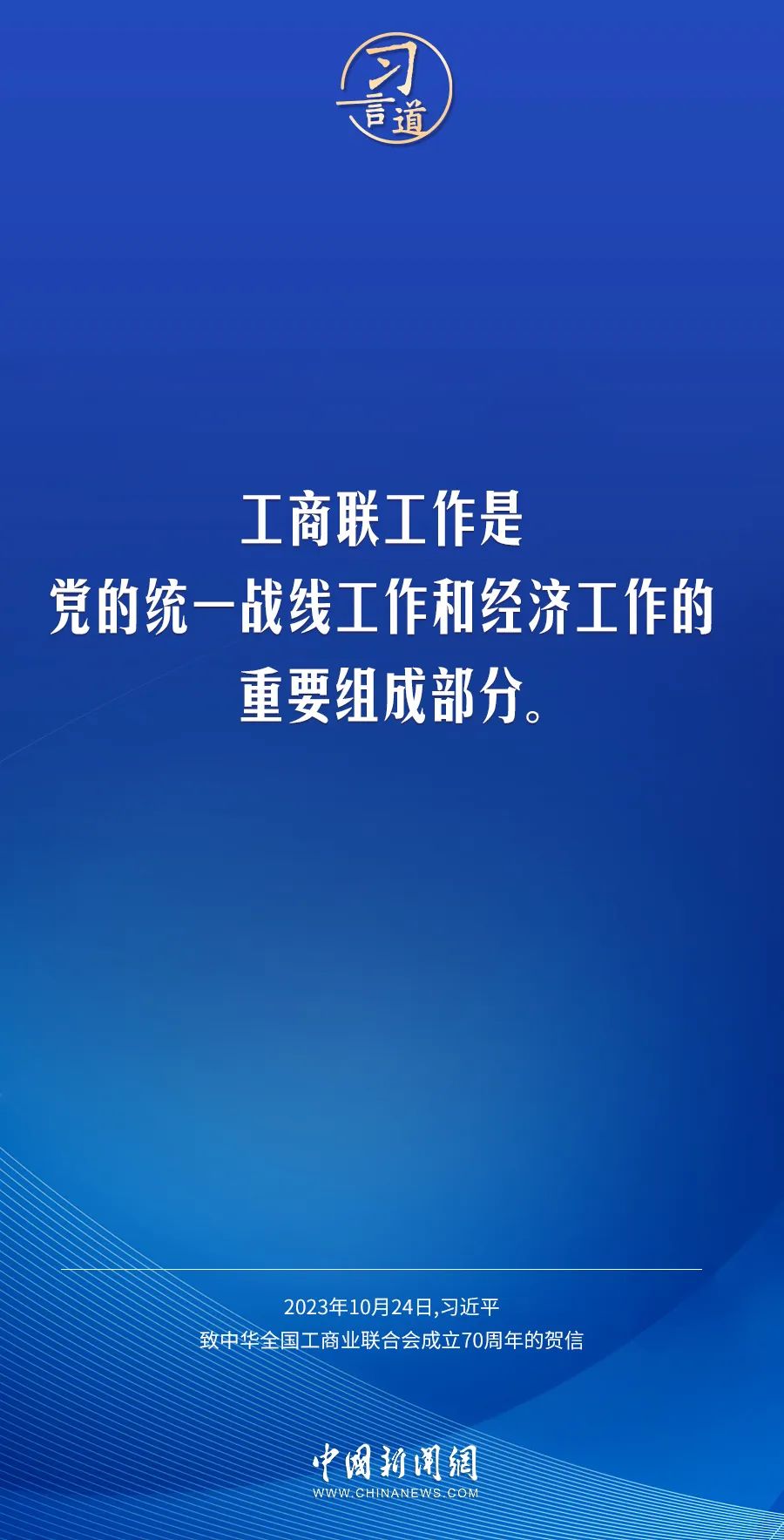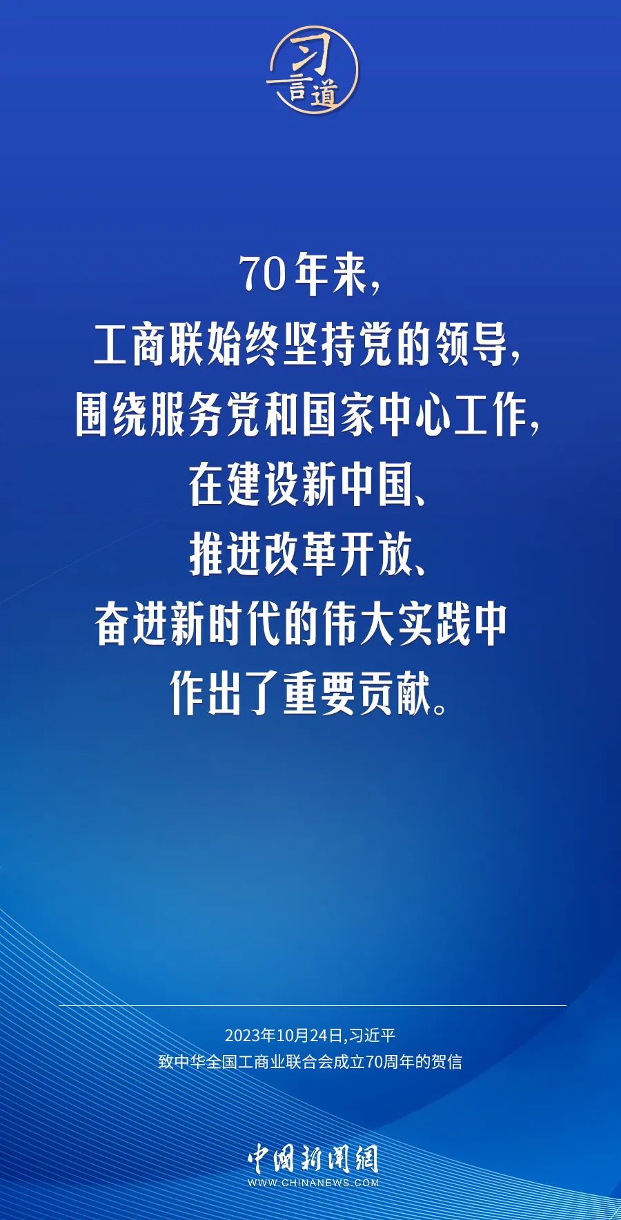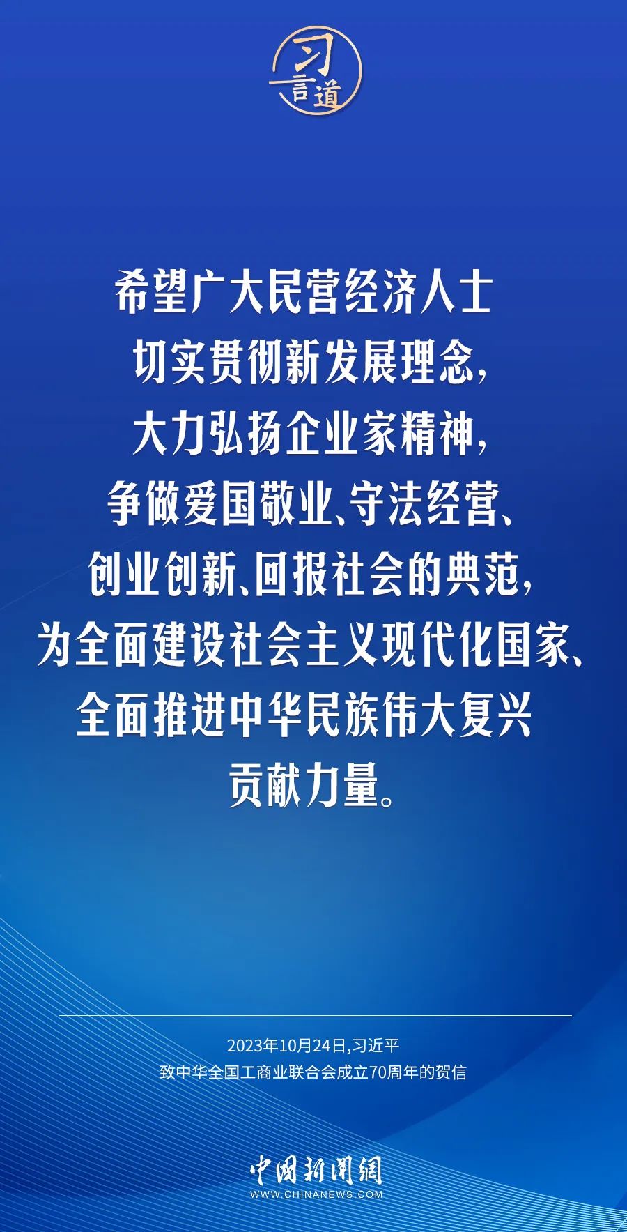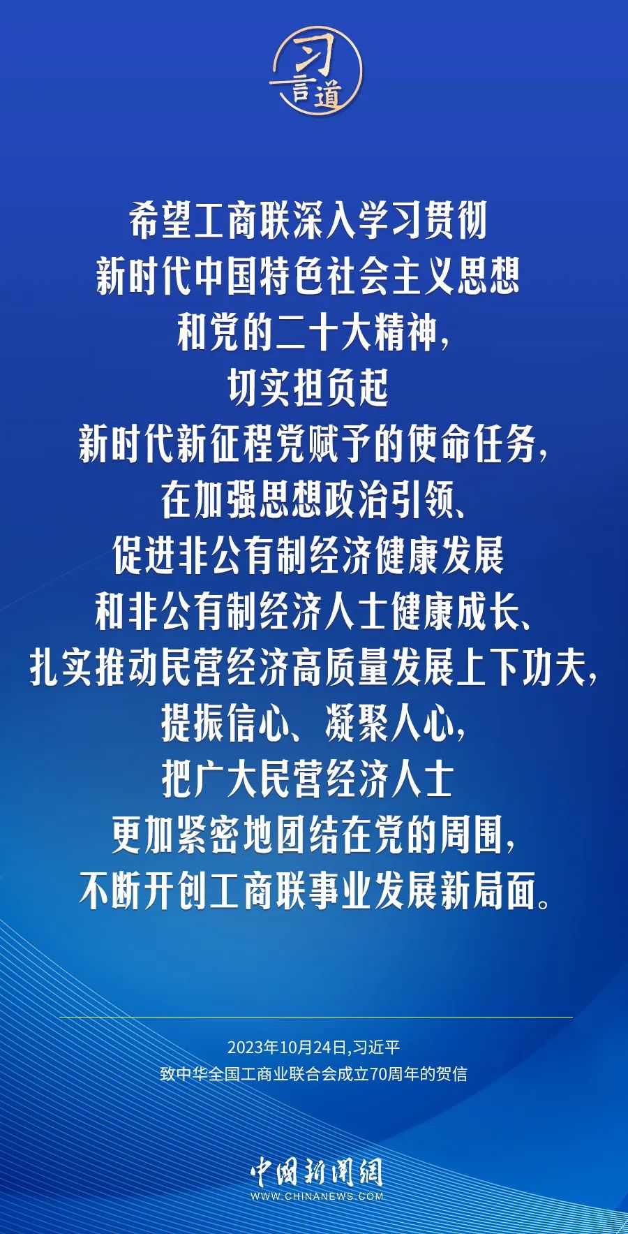 在中华天下工商业团结会建设70周年之际,中共中央总书记、国家主席、中央军委主席习近平发来贺信,代表党中央致以热烈祝贺,向工商联系统全体干部职工和天下宽大民营经济人士致以真挚问候 。